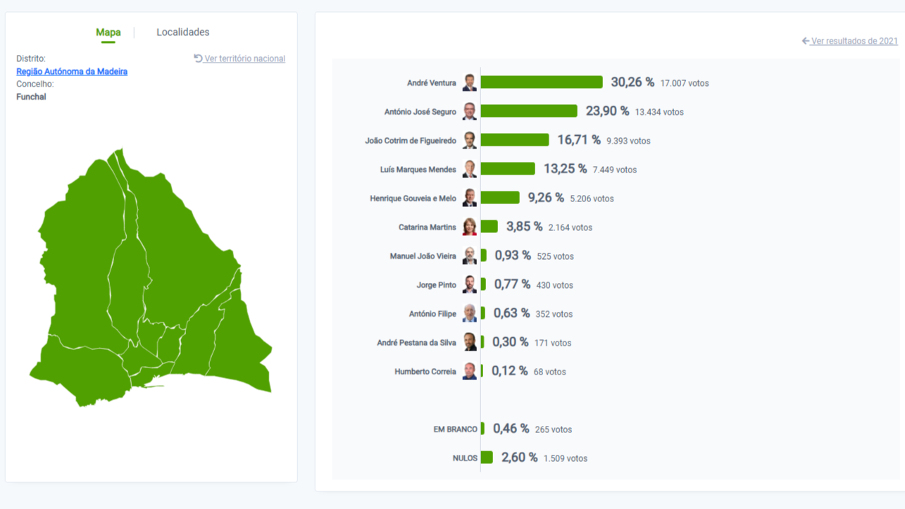 O candidato apoiado pelo Chega conseguiu 17.007 votos no Funchal, mais 3.573 votos que António José Seguro.