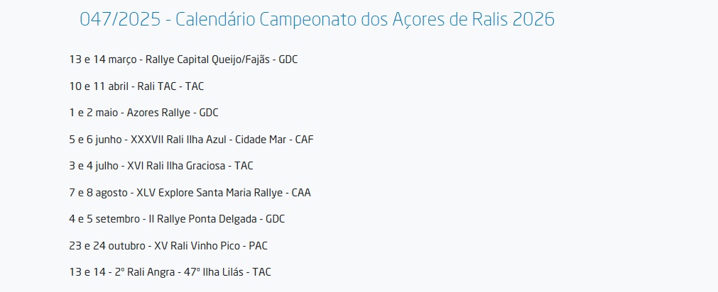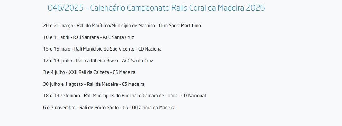 A temporada madeirense tem 8 provas e a açoriana é composta por 9 ralis
