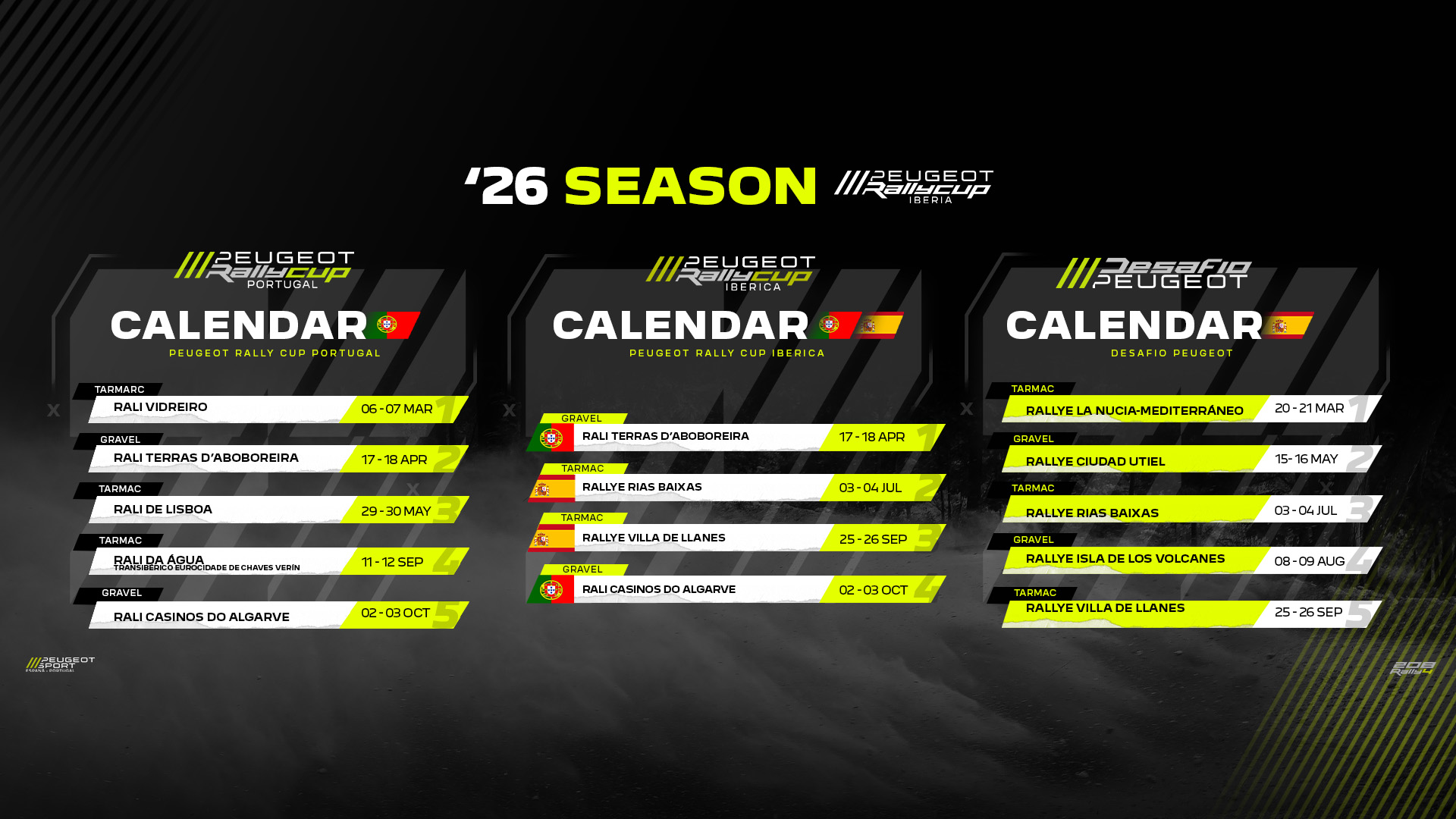 Por seu turno, tendo completado 40 anos em 2025, o Desafio Peugeot mantém-se como o único troféu de promoção espanhol a contar, nesta época, com um calendário misto, combinando dois tipos de piso. Terá início no Rallye La Nucía-Mediterráneo (20-21 de março), prova inaugural do S-CER (SuperCampeonato de Espanha de Ralis) 2026, integrando ainda o Rallye Rías Baixas (3-4 de julho) e o Rallye Villa de Llanes (25-26 de setembro), a encerrar a época, dois ralis emblemáticos em asfalto. Entre eles duas provas em terra, ambas inéditas no troféu: o Rallye Ciudad de Utiel (15 e 16 de maio) e o Rallye Isla de Los Volcanes (8 e 9 de agosto), uma estreia em território canário, integrando o renovado Desafio Peugeot, evento que contará com vantajosas ajudas e bónus, de modo a facilitar a participação das equipas peninsulares.