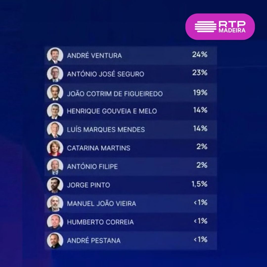 Se as eleições presidenciais fossem hoje, André Ventura e António José Seguro seriam os candidatos que passariam a uma segunda volta, com 24% e 23% dos votos respetivamente.
