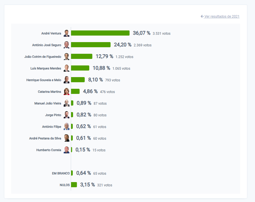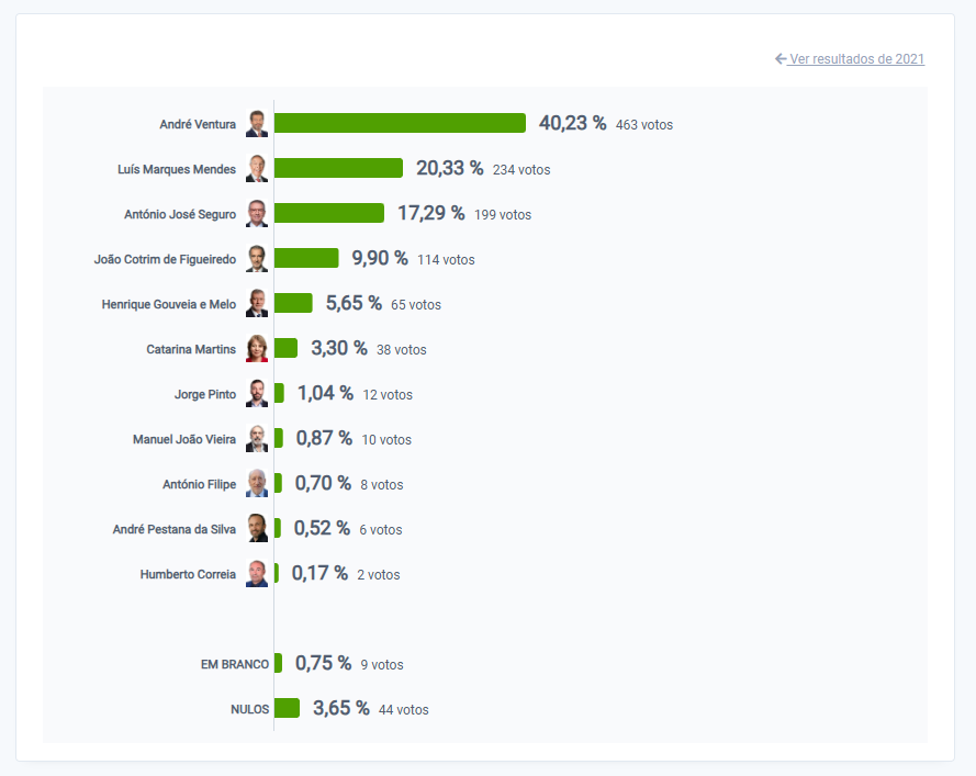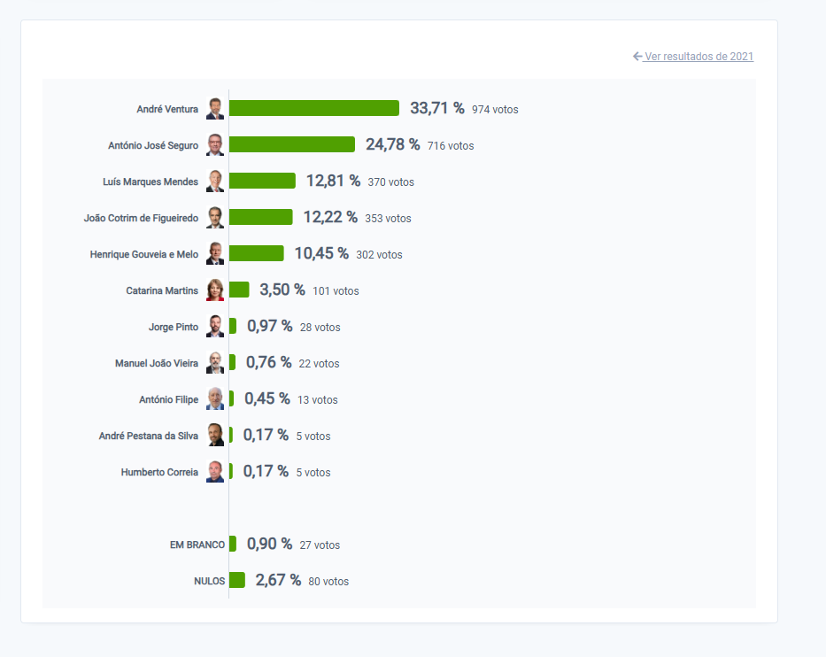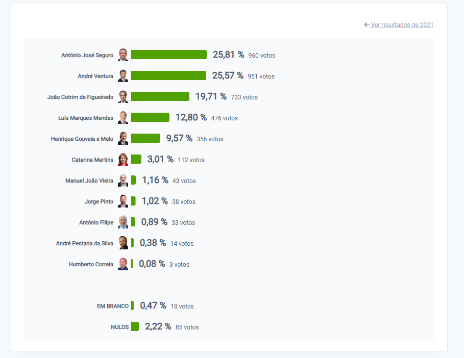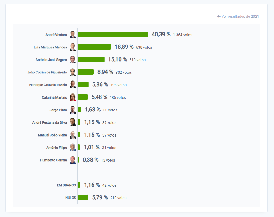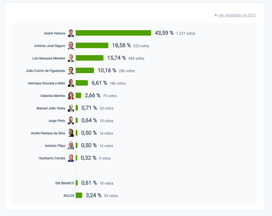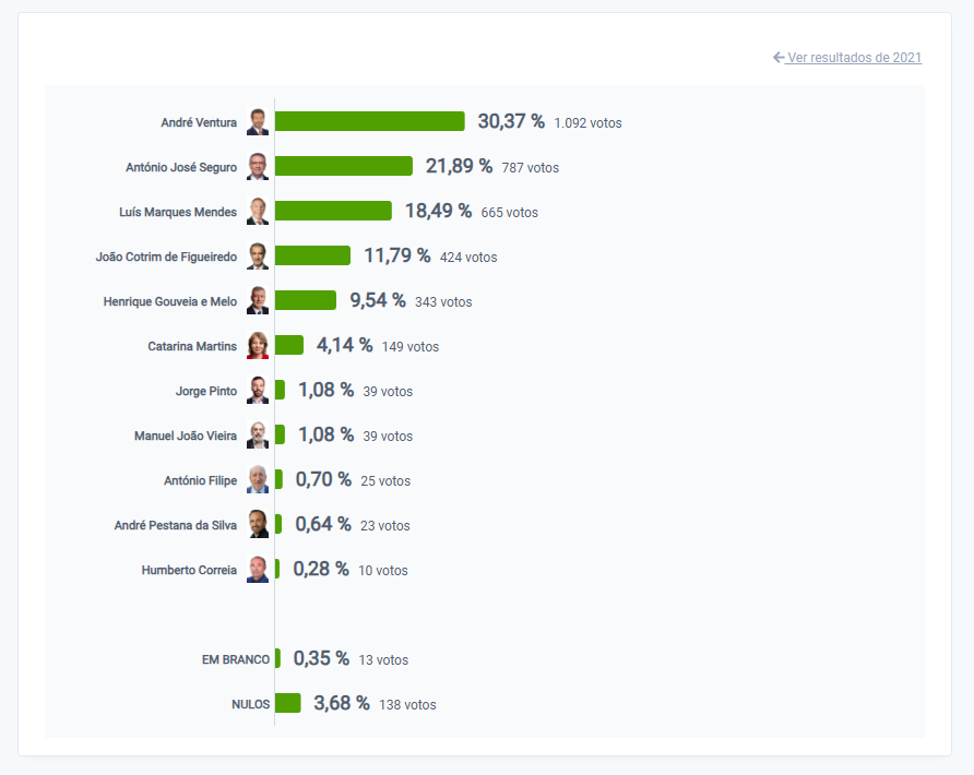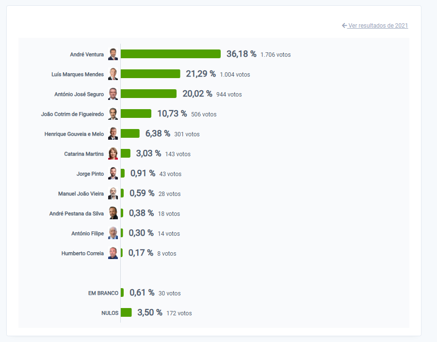 Com 70% de votos contados, André Ventura lidera as votações na Madeira com 34,43%. António José Seguro é segundo com 16 das 54 freguesias fechadas.