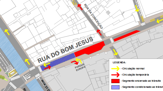 Relativamente ao troço já intervencionado, entre a Rua 31 de Janeiro e o Centro Comercial Europa, vai ser reaberto à circulação, funcionando nos dois sentidos, permitindo apenas o acesso de e para o parque de estacionamento assim como para efeitos de operações de carga e descarga.